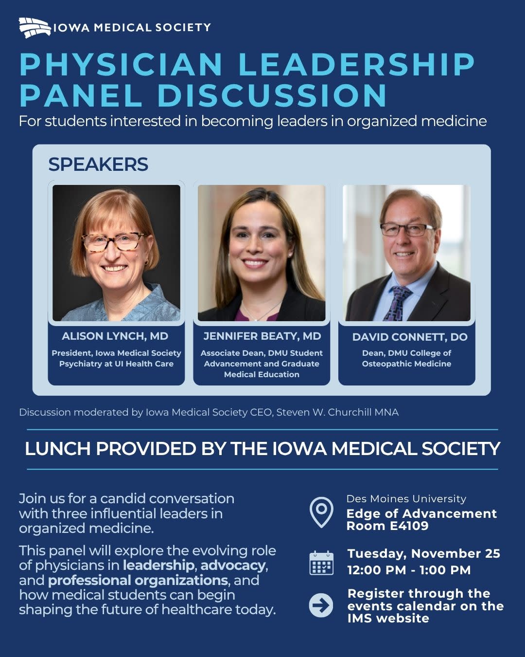 Join us for an inspiring and candid conversation with three influential leaders in organized medicine in Iowa. This panel will explore the evolving role of physicians in leadership, advocacy, and professional organizations, and how medical students can begin shaping the future of healthcare today.